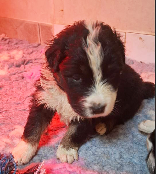 Description : Bora noir tricolore disponible à partir du 11 avril la maman c'est Soline et le papa Road donc grande chance que les chiots aux les yeux bleu .